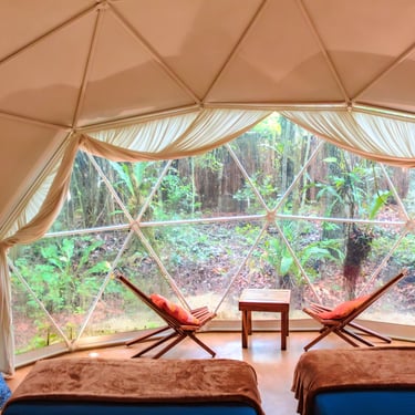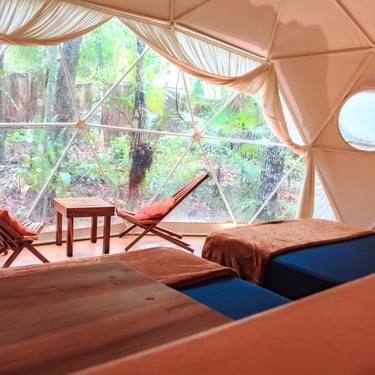 Por las noches, descansarán en un cómodo domo familiar rodeado de árboles, y en una de ellas vivirán un momento especial con una fogata bajo el cielo estrellado. Además, disfrutarán de una relajante sesión privada en un jacuzzi tipo cenote para cerrar con broche de oro.
