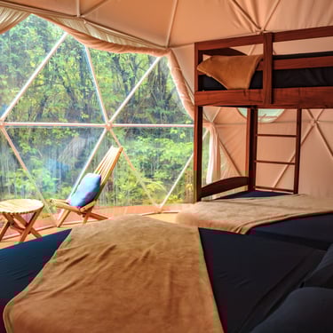 Después del tour, relájense en un acogedor domo entre árboles, y vivan una noche especial compartiendo historias y malvaviscos en una fogata privada bajo el cielo estrellado.