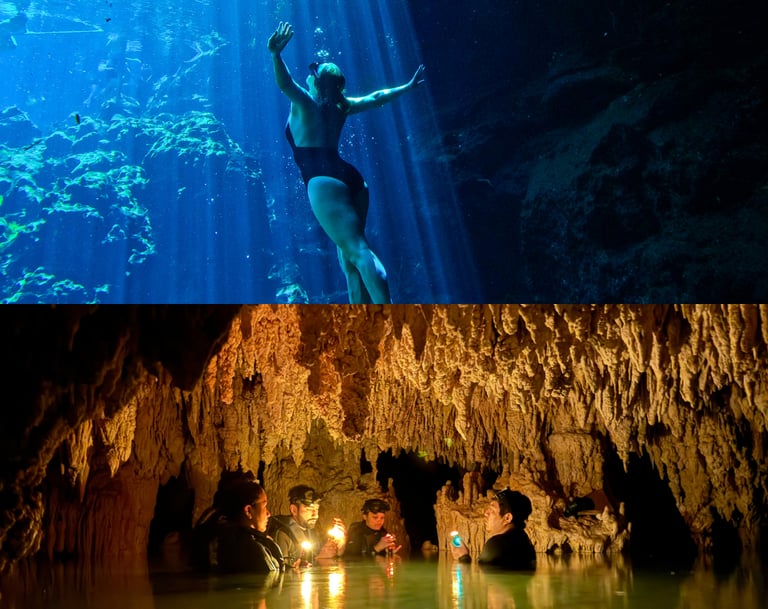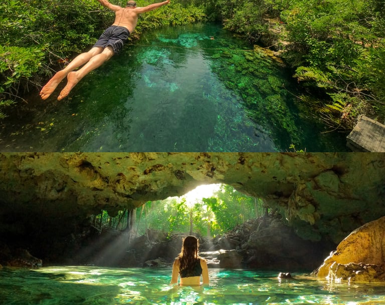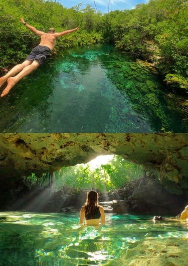 Vive una experiencia única explorando dos cenotes contrastantes: uno abierto, perfecto para nadar y saltar desde plataformas, y otro tipo cueva, ideal para practicar snorkel entre formaciones naturales. Disfruta esta aventura guiada con equipo completo de seguridad, lámpara acuática y seguro médico incluido —una combinación fascinante entre la luz y la oscuridad.